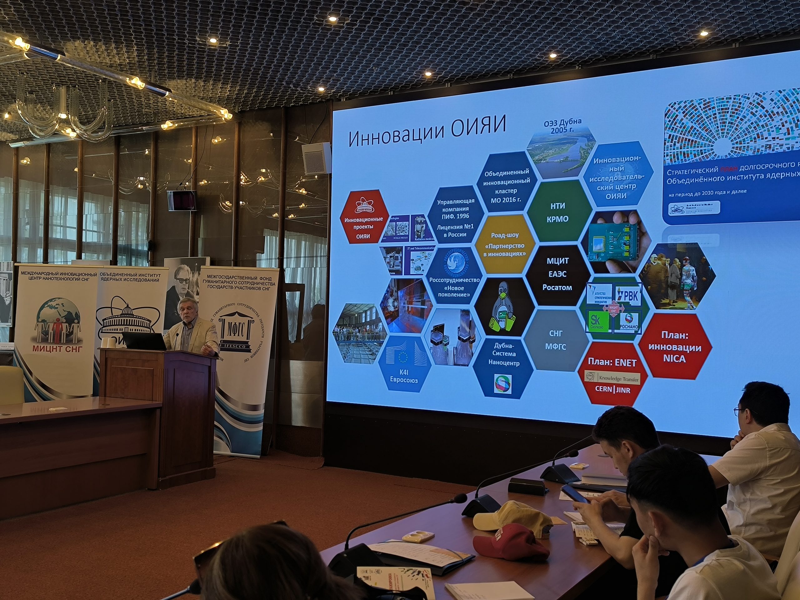 На открытии Стажировки директор МИЦНТ СНГ А. В. Рузаев рассказал об истории создания МИЦНТ СНГ, целях и направлениях его работы: центр создан в 2009 году как инструмент интеграции инновационной деятельности в международную глобальную систему с привлечением научных, образовательных и инновационных организаций из государств, являющихся участниками и партнерами Объединенного института ядерных исследований. За это время более 500 молодых ученых из более 60 научных учреждений стран СНГ имели возможность поработать в лабораториях ОИЯИ, установить научные связи с учеными Института по темам своих исследований.