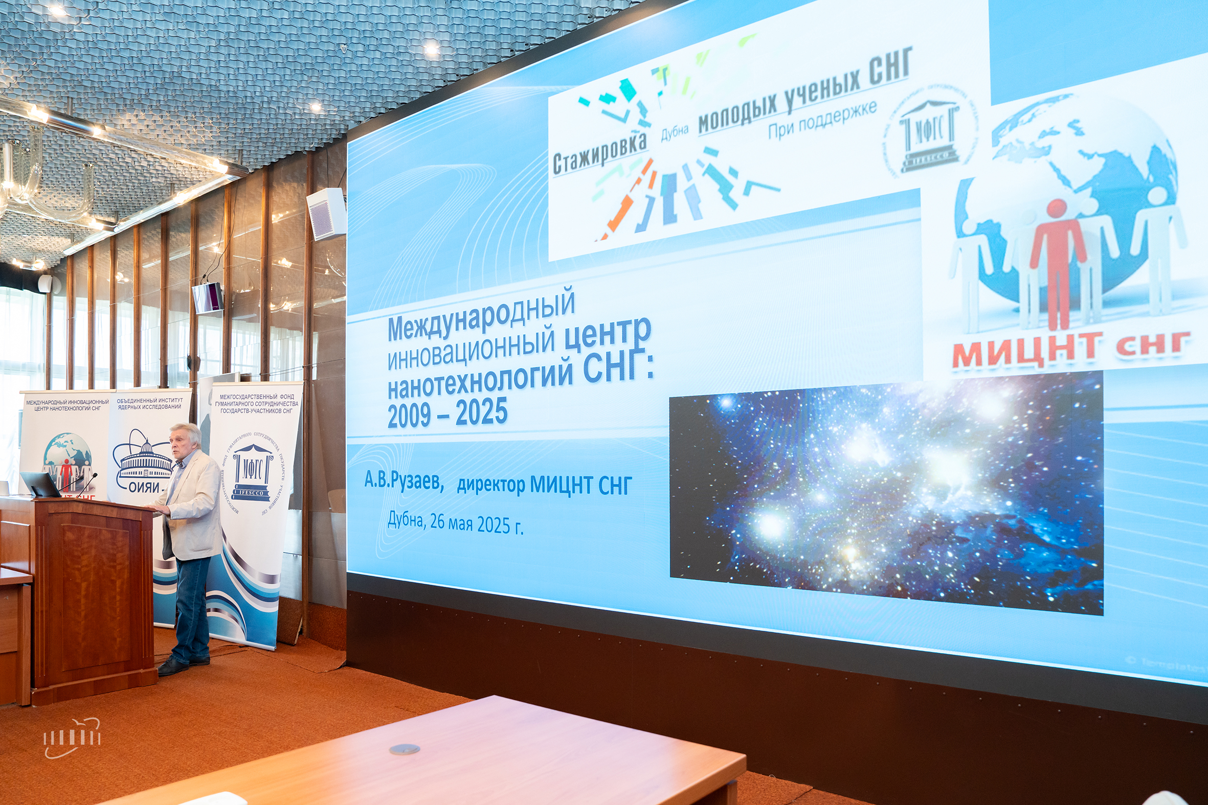 26 мая 2025 года в Доме международных совещаний ОИЯИ открылась Стажировка молодых ученых и специалистов стран СНГ, организованная Международным инновационным центром нанотехнологий СНГ при поддержке Межгосударственного фонда гуманитарного сотрудничества государств – участников СНГ и Объединенного института ядерных исследований. МИЦНТ СНГ проводит данное мероприятие ежегодно с 2009 года, и в 2025 году эта уже восемнадцатая Стажировка. В течение месяца молодые люди будут знакомиться с направлениями научной и инновационной деятельности Объединенного института, университета «Дубна», Особой экономической зоны «Дубна» и выполнять в международных группах проекты на свободные темы. Проекты участников, как начатые непосредственно на стажировке, так и те, к которым они приступят впоследствии, смогут претендовать на получение грантов Международного инновационного центра нанотехнологий СНГ (МИЦНТ СНГ).