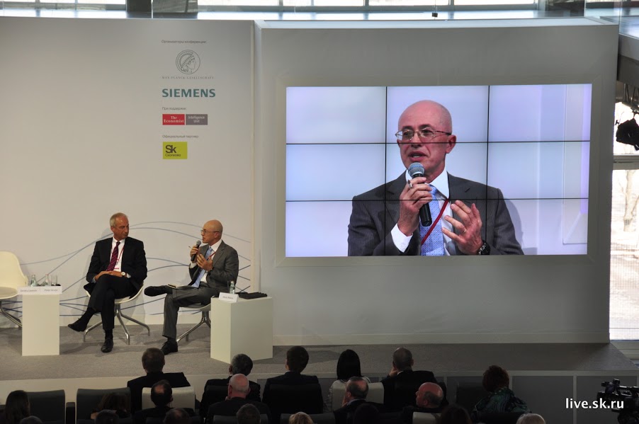 Открыли конференцию председатель Правления «Сименс АГ» Петер Лёшер, президент «Сколково» Виктор Вексельберг и президент Общества им. Макса Планка Петер Грусс.